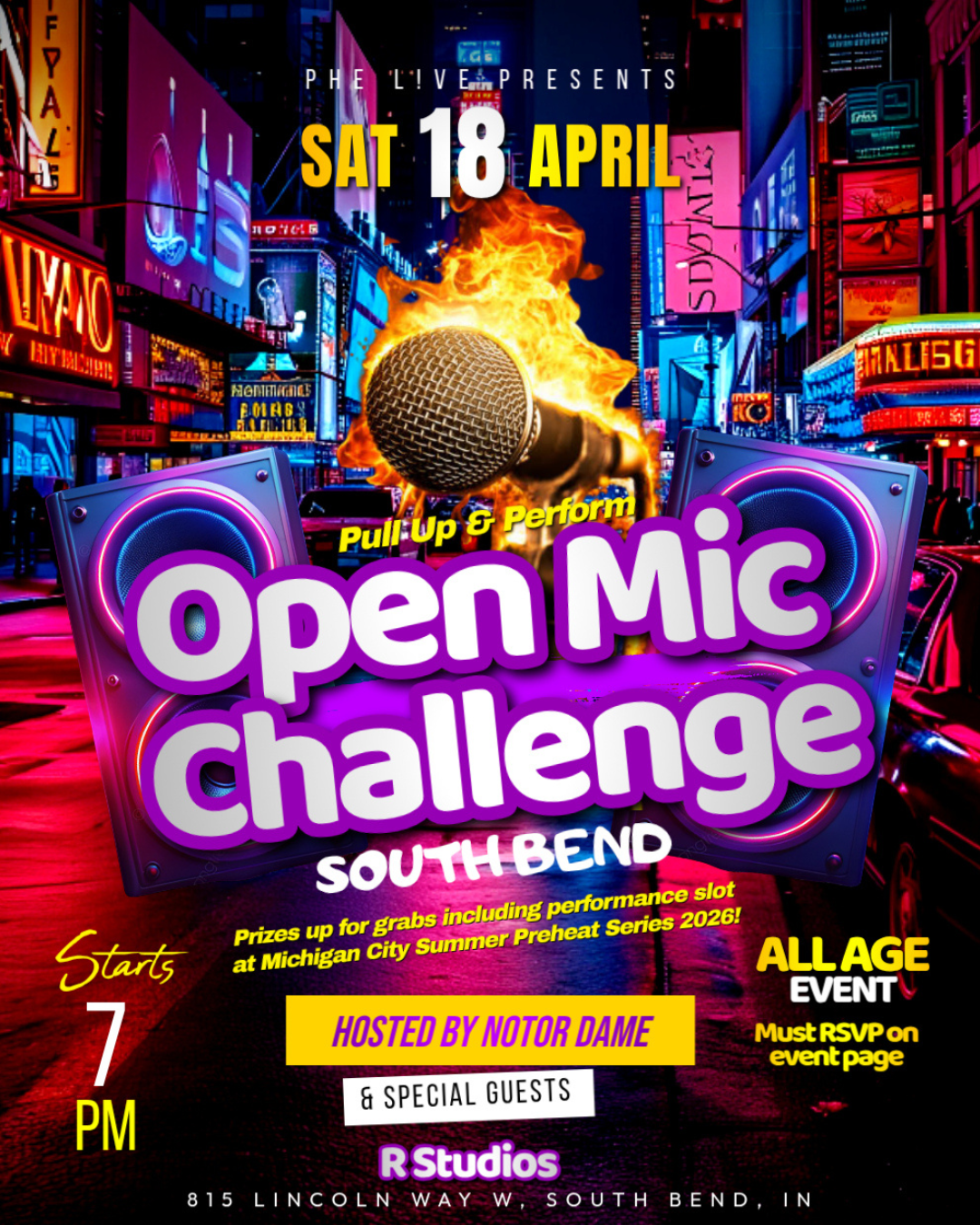 Open Mic Challenge - South Bend Saturday, April 18, 2026 7:00 PM 10:00 PM R Studios 815 Lincoln Way West South Bend, IN, 46616 United States (map) Google Calendar ICS