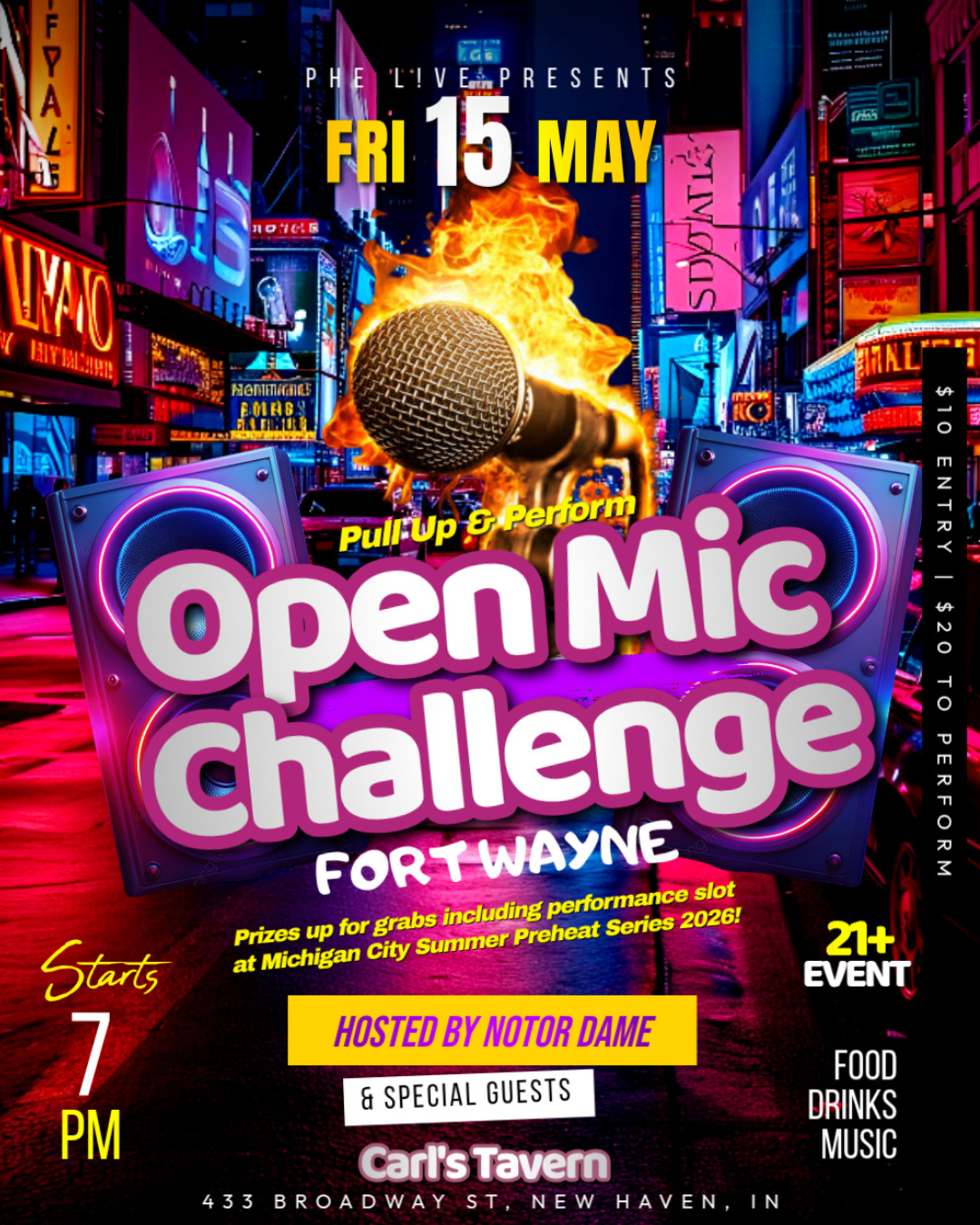 Open Mic Challenge - Fort Wayne Friday, May 15, 2026 7:00 PM 10:00 PM Carl's Tavern 433 Broadway Street New Haven, IN 46774 United States (map) Google Calendar ICS