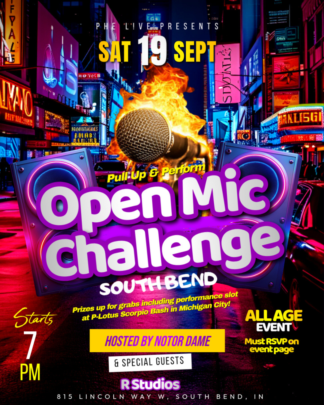 Back to All Events Open Mic Challenge - South Bend pt. 2 Saturday, September 19, 2026 7:00 PM 10:00 PM R Studios 815 Lincoln Way West South Bend, IN, 46616 United States (map) Google Calendar ICS