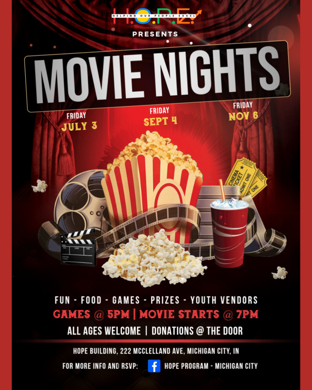 Family Movie Night pt. 1 (Michigan City) Friday, July 3, 2026 5:00 PM 9:00 PM H.O.P.E. Center 222 McClelland Avenue Michigan City, IN, 46360 United States (map) Google Calendar ICS
